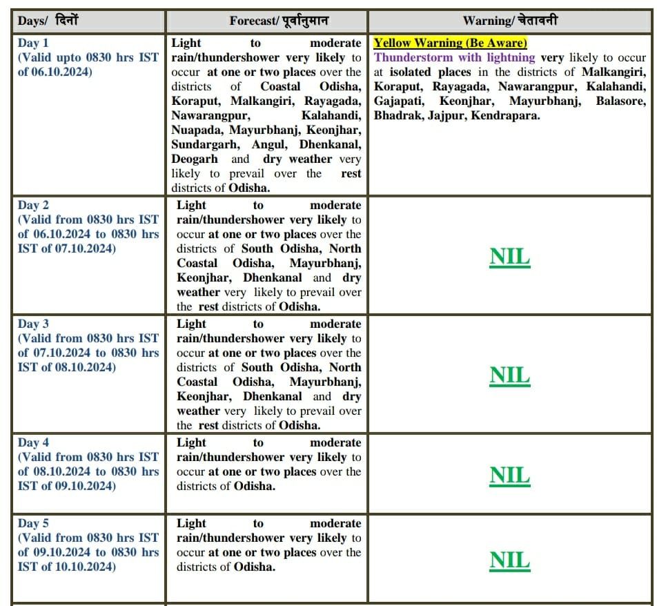Thunderstorm with lightning is likely to occur at isolated places in the districts of Malkangiri, Koraput, Rayagada, Nabarangpur, Kalahandi, Gajapati, Keonjhar, Mayurbhanj, Balasore, Bhadrak, Jajpur, and Kendrapada during the period. The weather agency issued yellow warning for these districts.