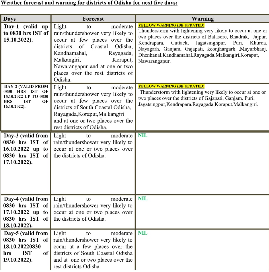 Meanwhile, a yellow warning for thunderstorm with lightning has been issued for one or two places in Balasore, Bhadrak, Jajpur,