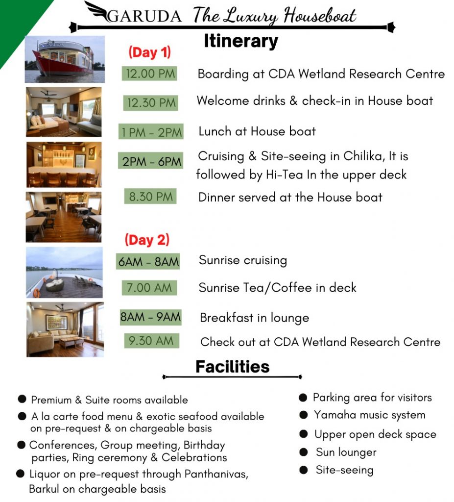 Bhubaneswar: The first luxury houseboat, Garuda, has begun sailing in Chilika Lake from Barkul, about 90 km from Bhubaneswar, after Chief Minister Naveen Patnaik inaugurated it last month.