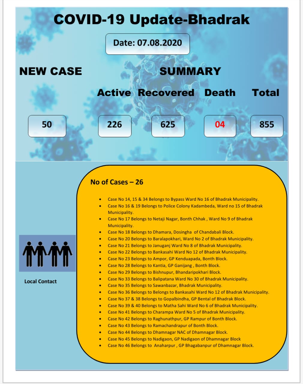 Among the local contact cases, the majority are from Bhadrak Municipality. The district has also reported one more death on Friday.