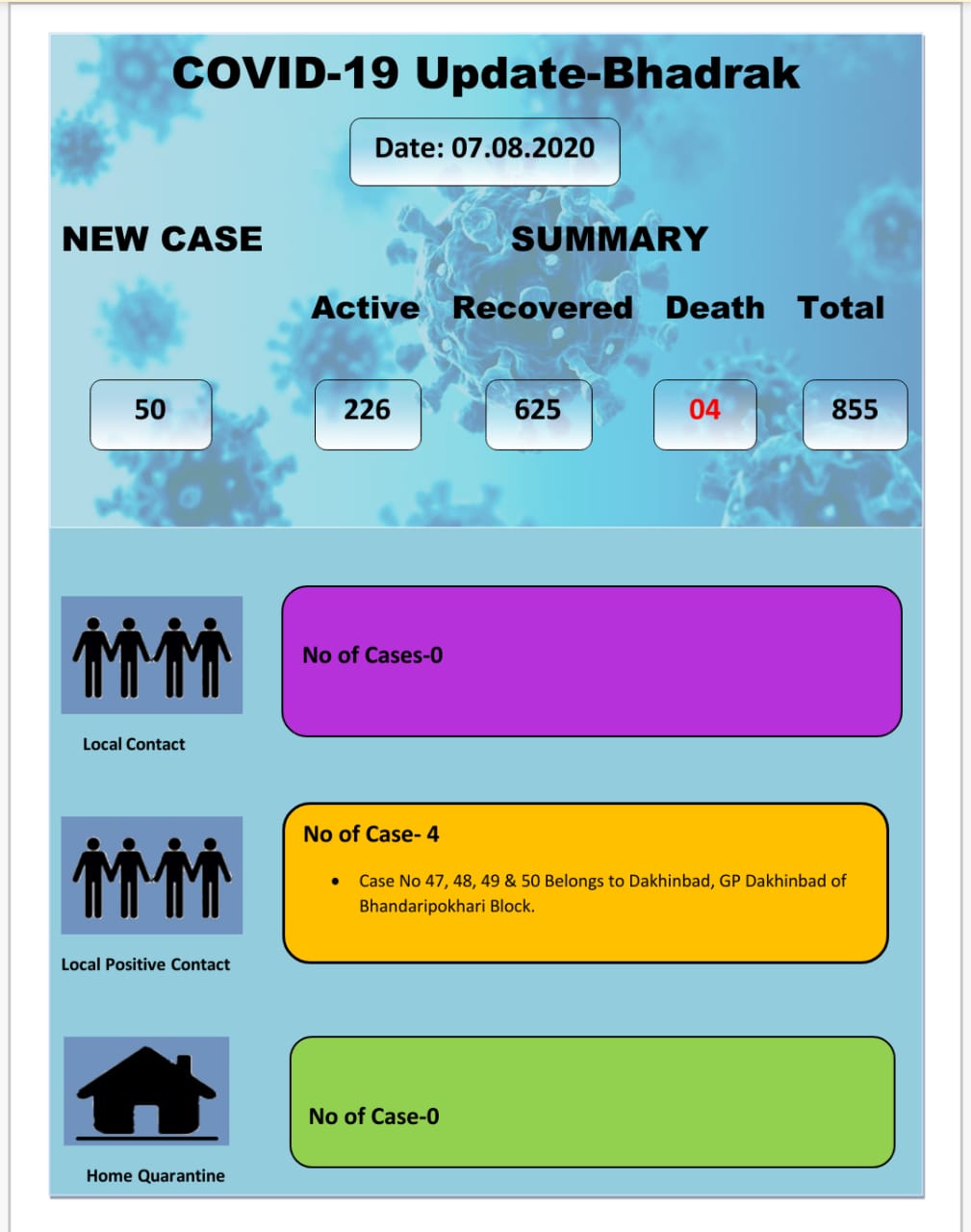 With four deaths and 625 recoveries, Bhadrak now has 226 active cases.