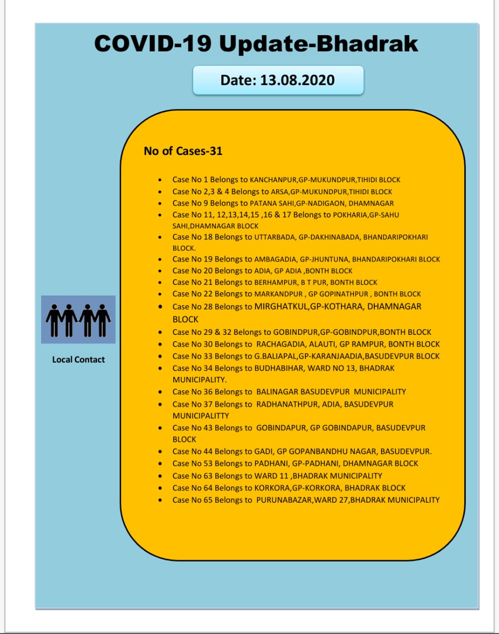 The highest of 32 cases are from Dhamnagar, followed by 11 from Basudevpur, six from Bonth, four from Tihidi, three each from Bhadrak block, and municipality, and two from Bandaripokhari.