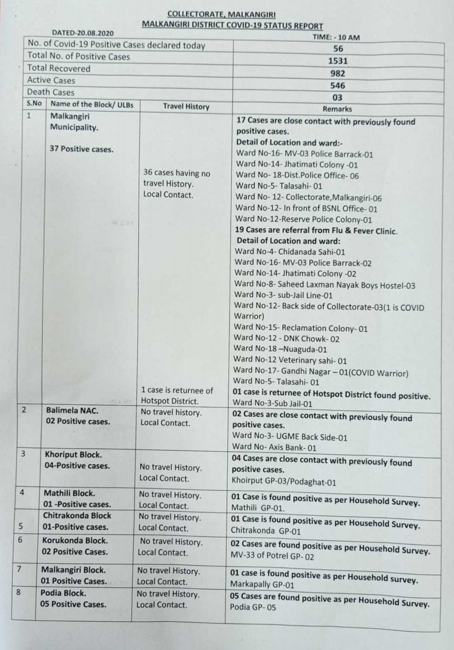 Malkangiri: The COVID-19 tally in Odisha’s Malkangiri district touched 1531 on Thursday with 56 new positive cases.