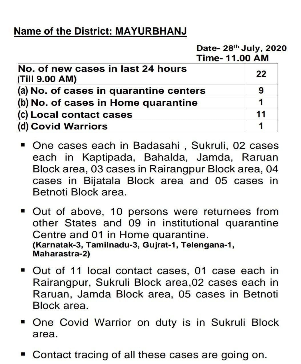 Mayurbhanj: The COVID-19 tally in Mayurbhanj district touched 603 on Tuesday with 22 more persons testing positive for the virus in the last 24 hours.