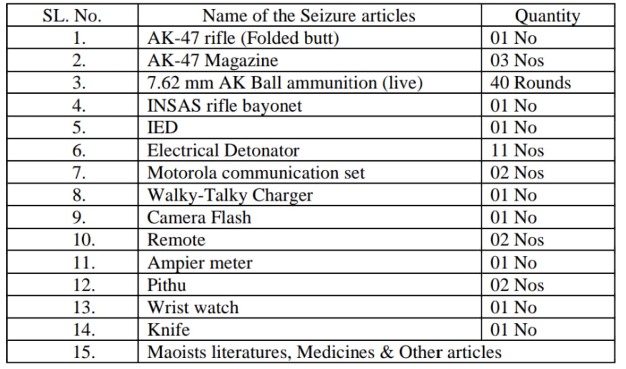 The seized items include AK-47 rifle and magazine, 7.62 mm AK Ball ammunition, IED, electrical detonator, Maoist literature and other items.