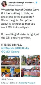 Taking to her Twitter handle, Sarangi asked if the government has nothing to hide anything and does not have any skeletons in the cupboard, it should announce CBI to investigate.
