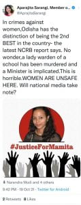 “No wonder, a lady warden of a school has been murdered and a Minister is implicated. This is horrible,” Sarangi said in the tweet which carried the slogan ‘Justice For Mamita’.