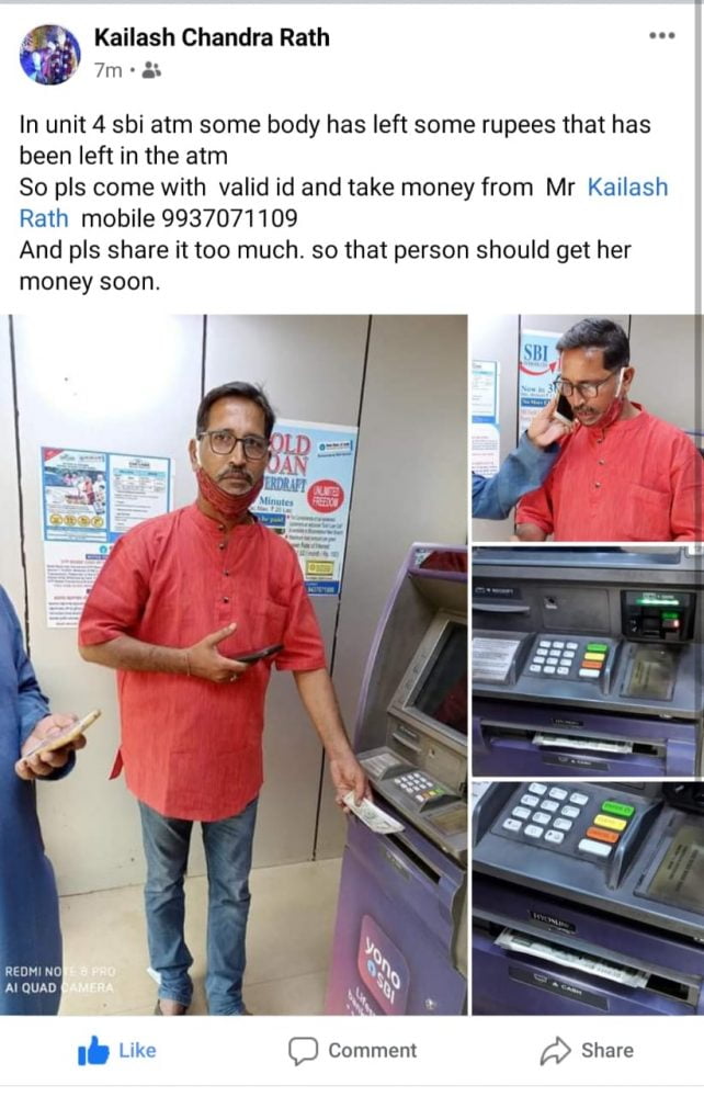 “In Unit-IV SBI ATM, somebody has left some rupees that has been left in the ATM. So please come with valid Id and take from me,” Rath said on Facebook.