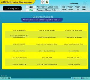 Bhubaneswar: The daily COVID-19 cases marginally dropped in the capital city where 170 persons tested positive for the virus in the last 24 hours compared to 197 cases on Tuesday.