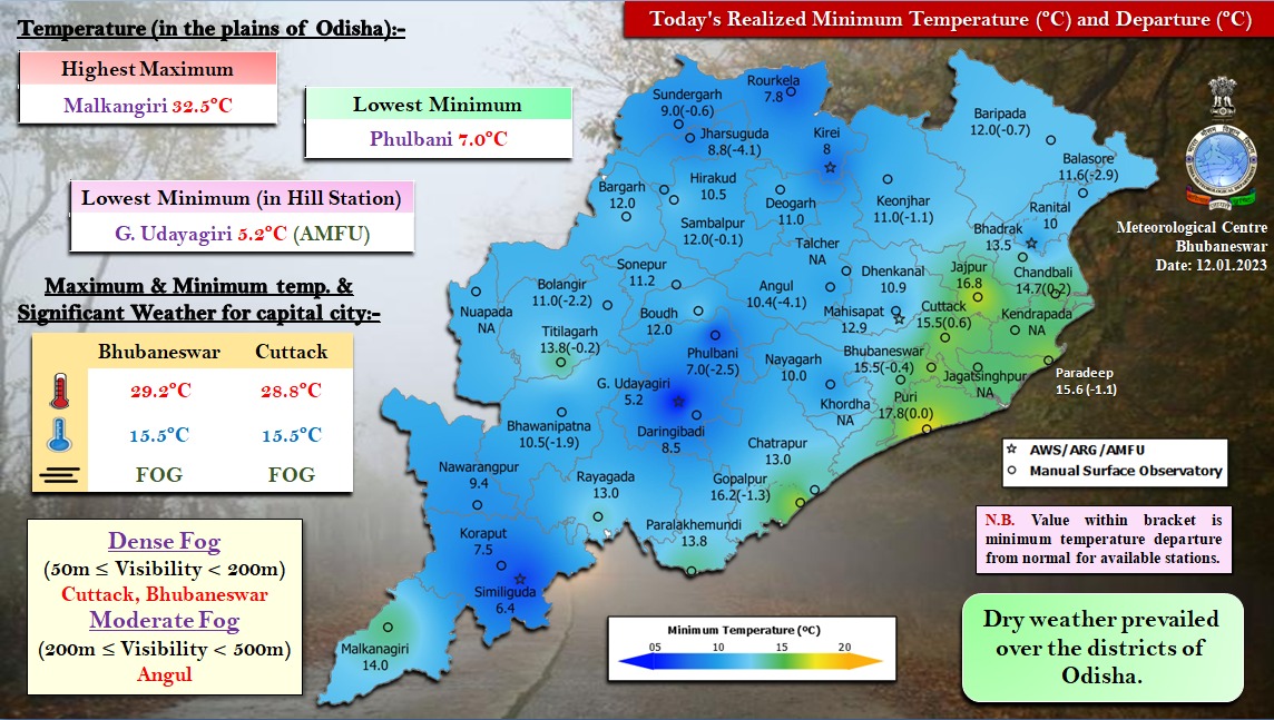 Both Bhubaneswar and Cuttack recorded 15.5 degree Celsius.