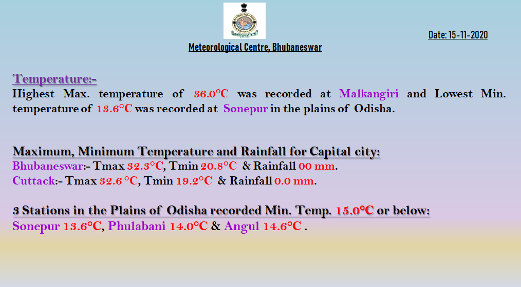 The night temperature has slumped significantly in the south coastal region and one or two places in the interior part of the state, said Bhubaneswar Meteorological Centre Scientist, Umasankar Das.