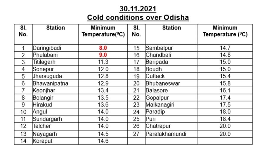 The other places which recorded below 15 degree Celsius are Titlagarh (11.3°C), Sonepur (12°C), Jharsuguda (12.8°C), Bhawanipatna (12.9°C), Keonjhar (13.4°C), Balangir (13.5 °C), Angul (14°C), Sundargarh (14°C), Talcher (14°C), Nayagarh (14.5°C), Koraput (14.6°C) and Sambalpur (14.7°C).