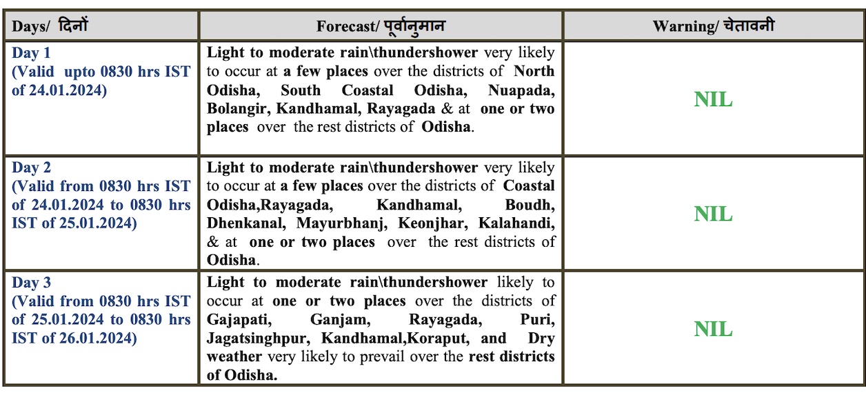 While there is no further fog warning, light to moderate rain will continue in coastal and South Odisha for three days. Dry weather conditions will prevail thereafter. The weather agency has also forecast a gradual fall in the night temperature by 2-3 degrees at many places in the state after two days.