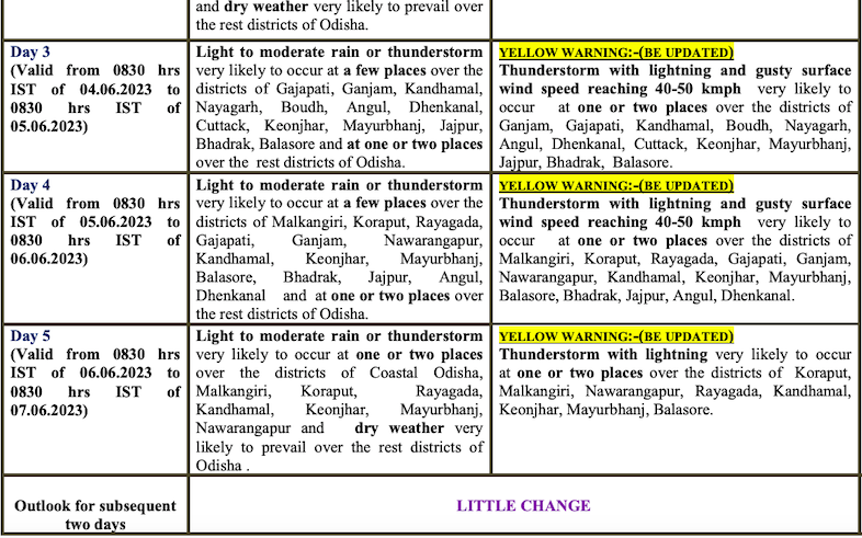 Yellow warning for light to moderate rain/thunderstorm with lightning and gusty surface wind speed reaching 30-40 kmph was also issued for some parts of districts of Mayurbhanj, Keonjhar, Balasore, Bhadrak, Kendrapada, Jagatsinghpur and Jajpur this afternoon. There was also a forecast for light to moderate rain/thunderstorm with lightning for some parts of Koraput, Rayagada, Gajapati, Kandhamal, Ganjam, Nayagarh, Angul, Dhenkanal and Cuttack.