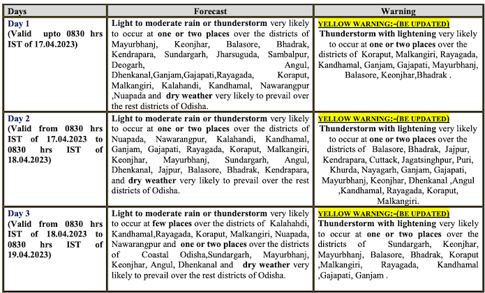 According to All-India Weather Bulletin at 8.45 this morning, light/moderate isolated rainfall with thunderstorm/lightning/gusty winds is very likely over Odisha from April 16-19. Thunderstorm with lightning & gusty wind (30-40 kmph) is likely at isolated places in Odisha for five days from April 16, it added