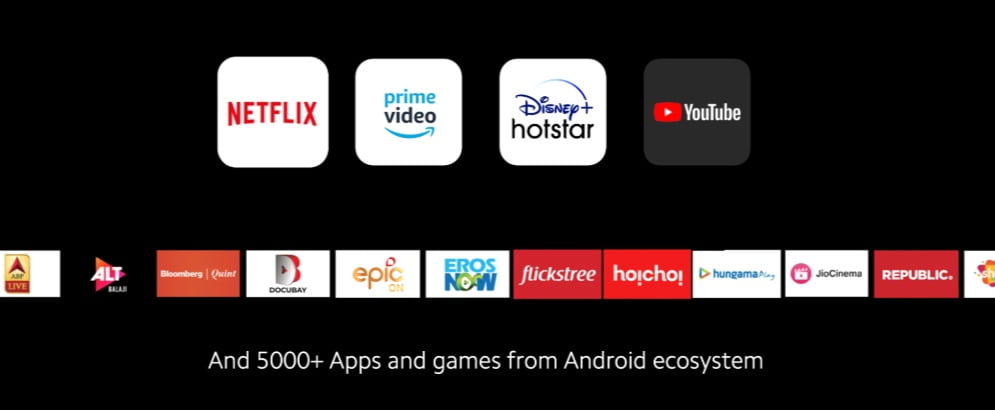 It boasts of 5,000 apps such as Netflix, Hotstar, Amazon Prime, Docubay, Epic, HoiChoi, and Shemaroo.