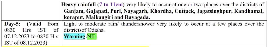 Yellow warning of heavy rain has also been issued for one or two places in Ganjam, Gajapati, Puri, Nayagarh, Khordha, Cuttack, Jagatsinghpur, Kandhamal, Koraput, Malkangiri and Rayagada on December 6.