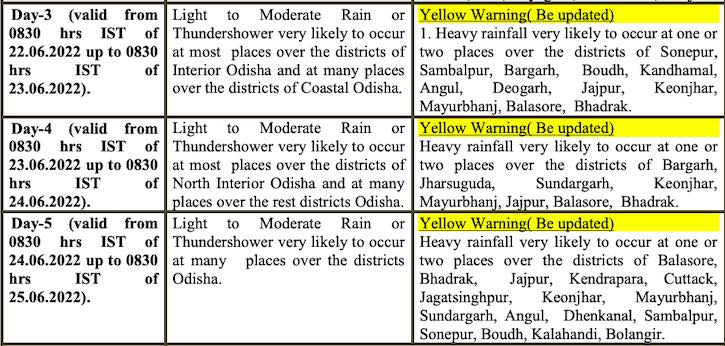 Yellow warning for thunderstorm with lightning has also been issued for one or two places in Balasore, Bhadrak, Jajpur, Kendrapada, Cuttack, Jagatsinghpur, Sundargarh, Jharsuguda, Bargarh, Sambalpur, Deogarh, Angul, Dhenkanal, Keonjhar, Mayurbhanj, Khurda, Puri, Nayagarh, Kandhamal and Ganjam.