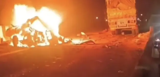 Mirzapur: A multi-vehicle pile-up, suspected to have been caused by a truck’s brake failure, trapped and crushed a passenger car between two heavy vehicles before sparking a fiery chain reaction in Uttar Pradesh’s Mirzapur district.