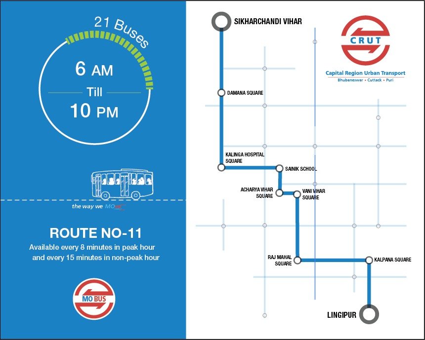 Bhubaneswar:Mo Bus service will be made operational on Route no. 11, connecting Sikharchandi Vihar to Lingipur, from Friday. A total of 21 buses will ply on this route from 6 am to 10 pm.
