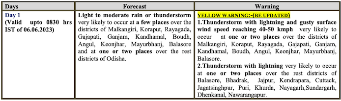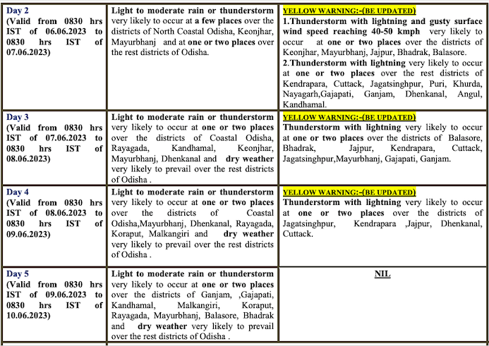 Meanwhile, Odisha will continue to remain under the influence of Nor’wester. Yellow warning for thunderstorm with lightning and gusty surface wind speed reaching 40-50 kmph has been issued for several districts till June 6. There is also a forecast for light to moderate rain at some places in all districts of the state during this period.