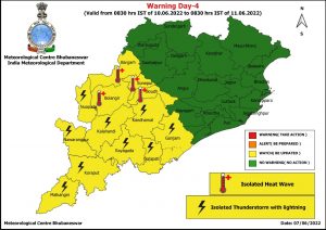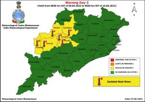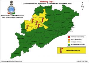 Heatwave conditions will continue to prevail in some districts of western Odisha till 8.30 am on May 11. The IMD has issued yellow warning for Bargarh, Sonepur, Balangir, Boudh, Sambalpur and Nuapada from 8.30 am on May 8.