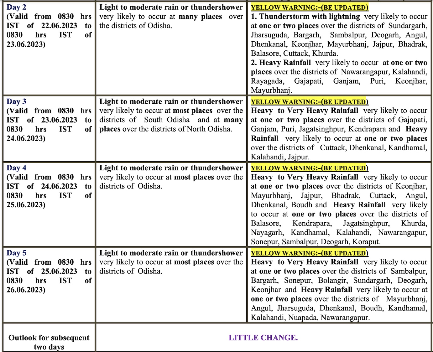 The Met Office further said that isolated heavy rainfall is likely in Odisha between June 21 and June 25 with isolated very heavy falls on June 23-24. Heatwave to severe heatwave conditions, however, are likely to continue in isolated pockets in interior Odisha on June 21-22.