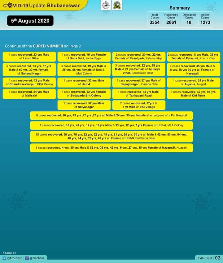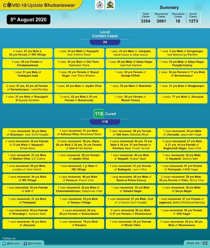 With 18 deaths and 2061 recoveries, Bhubaneswar now has 1273 active cases.