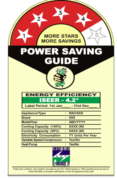 The Bureau of Energy Efficiency (BEE) rates (0-5) and labels appliances on their energy efficiency. The yellow and red stickers on an air conditioner can tell you how much power the appliance consumes. A higher star (5) equates to lower power consumption.