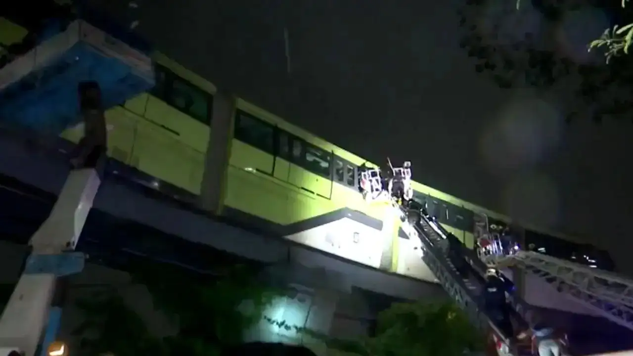The monorail train, which operates on an elevated track, was stranded for over three hours near Mysore Colony after it lost power supply amid heavy rain.