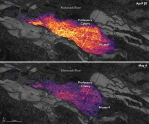 The images show where the lights went out. One can see the cities being lit up on April 30 (before Fani) and again on May 5, two days after Fani. The storm destroyed several transmission towers and uprooted around 156,000 utility poles.