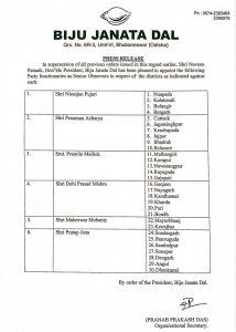 According to a press release of the BJD, Naveen appointed the senior observers in supersession of all previous orders issued in this regard.