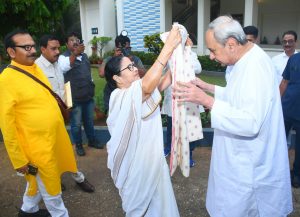 The Bengal CM reciprocated with a shawl specially prepared by Biswa Bangla. She also paid respect to his parents, Biju Patnaik, former chief minister of Odisha, and Gyan Patnaik by presenting a zamadani saree.