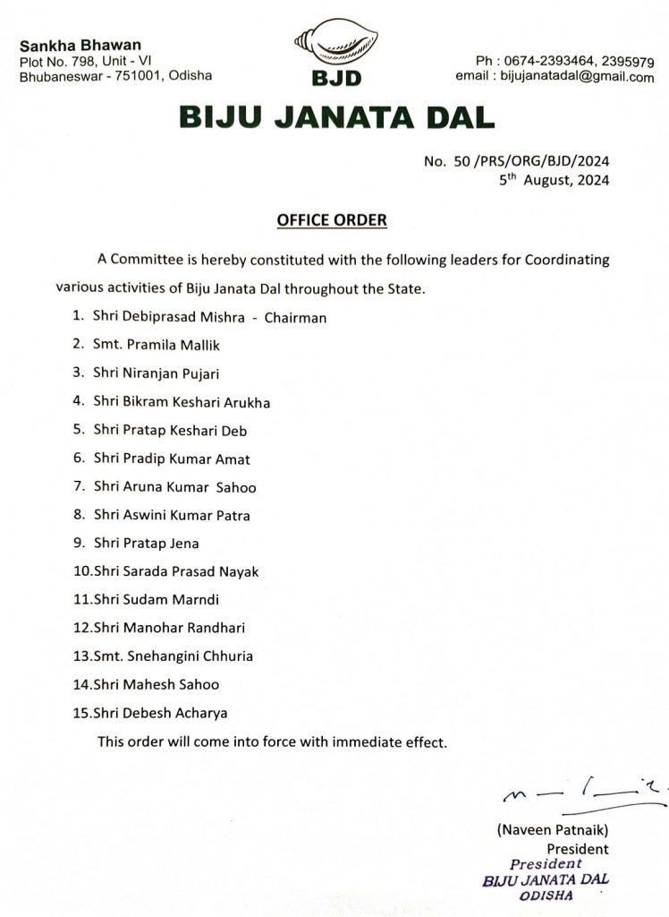 Bhubaneswar: Biju Janata Dal (BJD) president Naveen Patnaik on Monday constituted a committee for coordinating different activities of the party across Odisha.