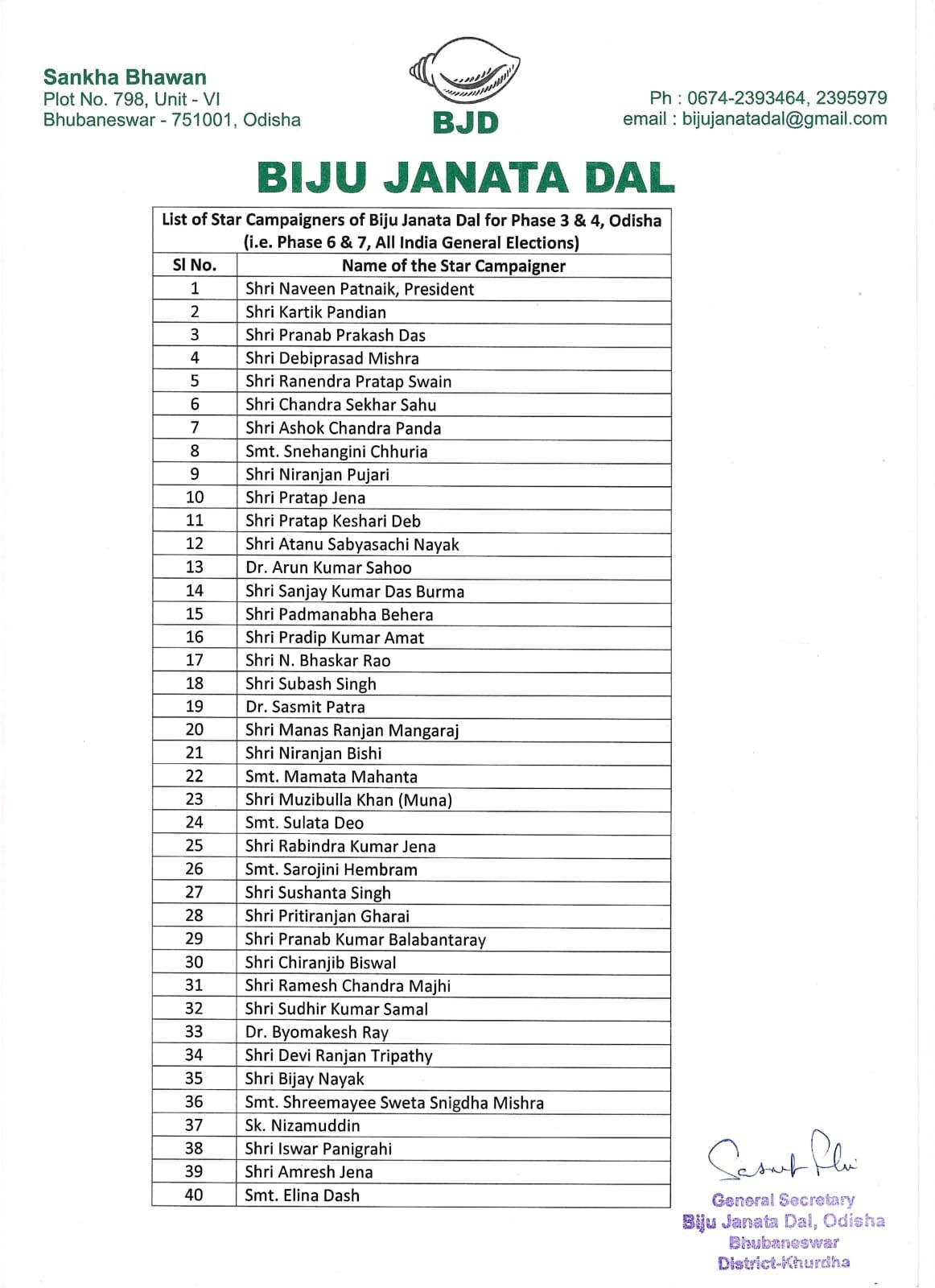 Bhubaneswar: The ruling Biju Janata Dal (BJD) on Friday has unveiled its roster of 40 star campaigners for the last two rounds of elections in Odisha.