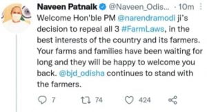 Naveen in a tweet said the prime minister’s decision to repeal all 3 farm laws is in the best interests of the country and the farmers. “Your farms and families have been waiting for long and they will be happy to welcome you back,” he said adding that BJD continues to stand with the farmers.