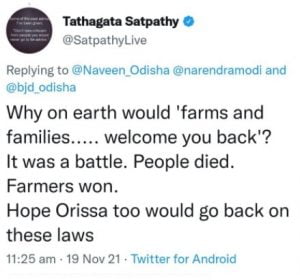 Former BJD leader Tathagat Satpathy in his twitter handle said it was a battle that was won by the farmers. “Why on earth would farms and families…welcome you back? It was a battle. People died. Farmers won. Hope Orissa too would go back on these laws,” he said.