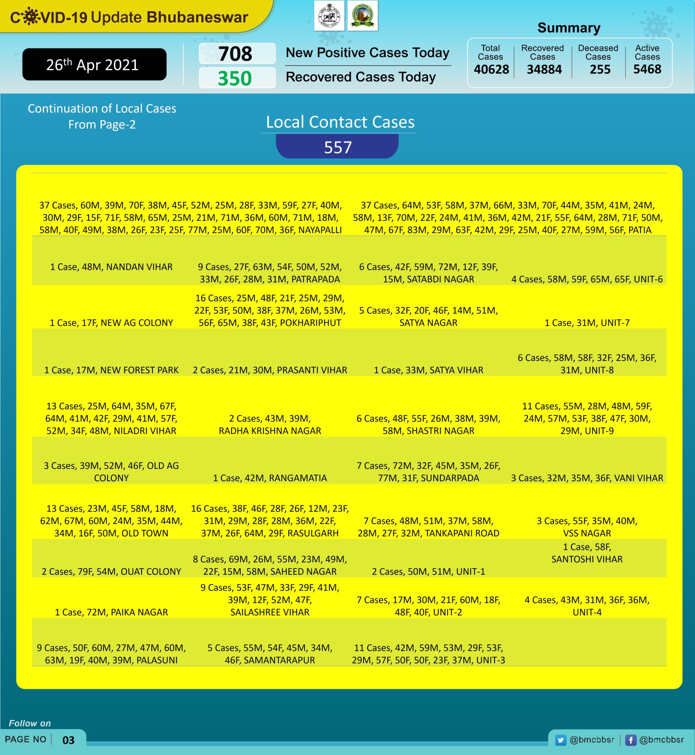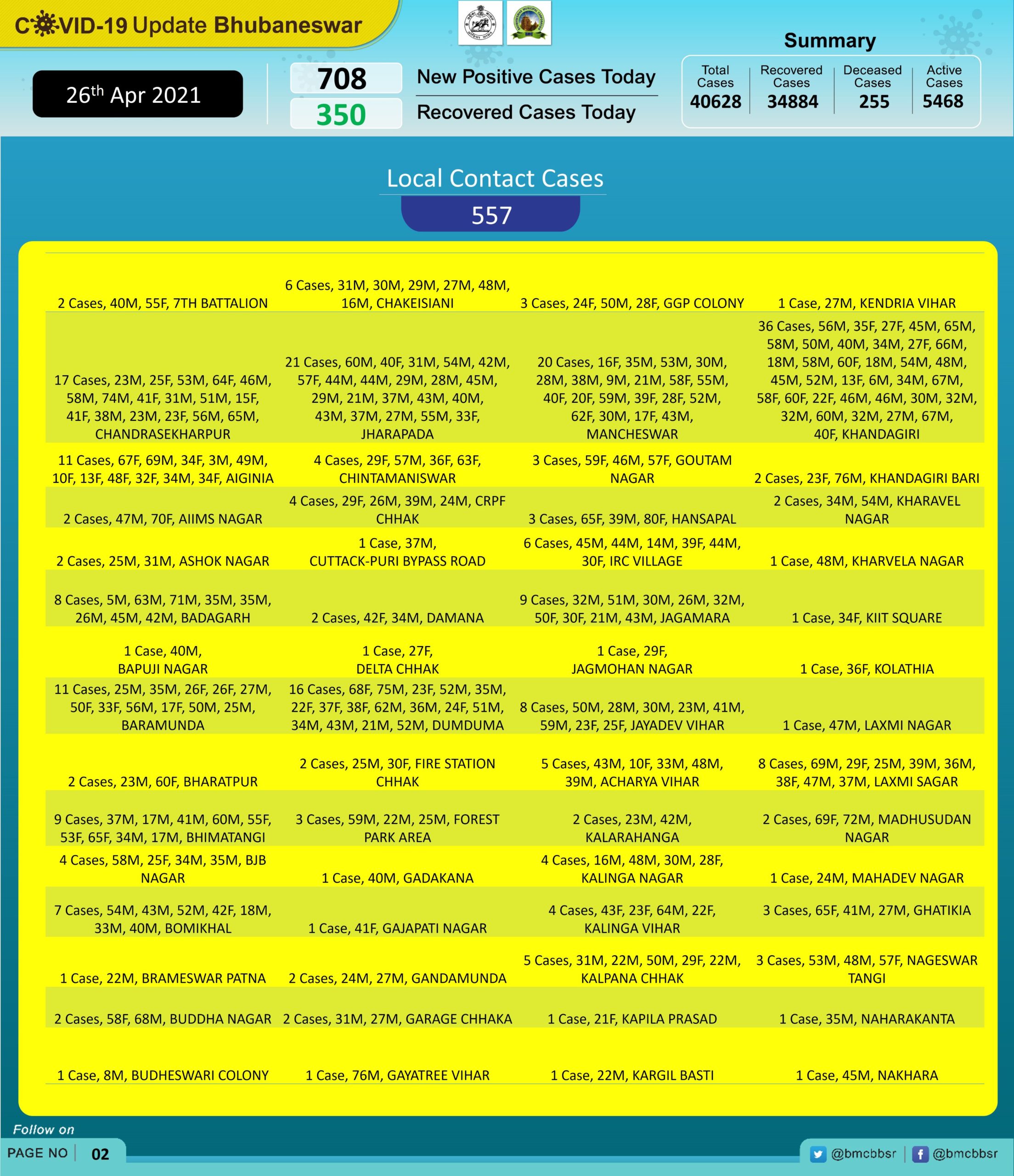 According to Bhubaneswar Municipal Corporation (BMC), 557 are local contacts and the rest 151 from quarantine centres.