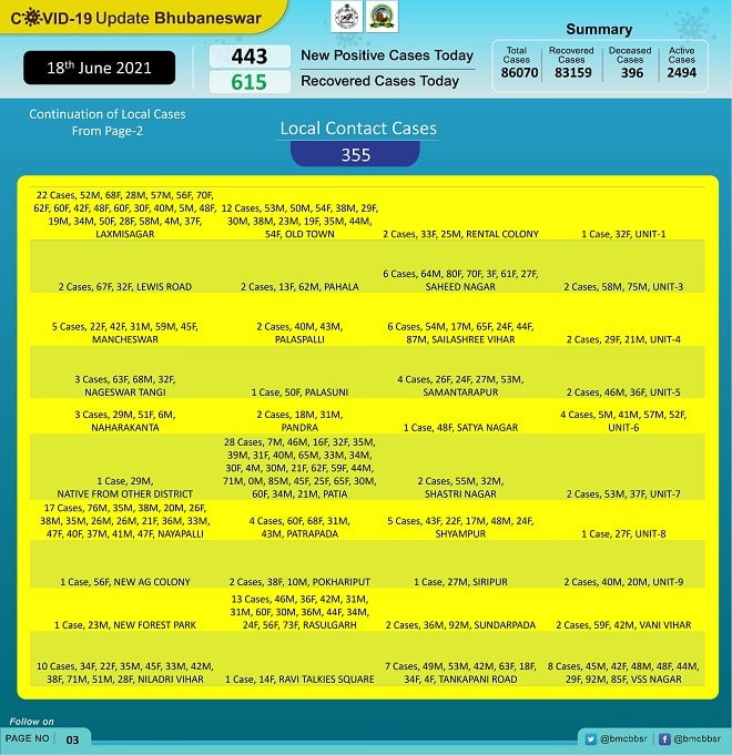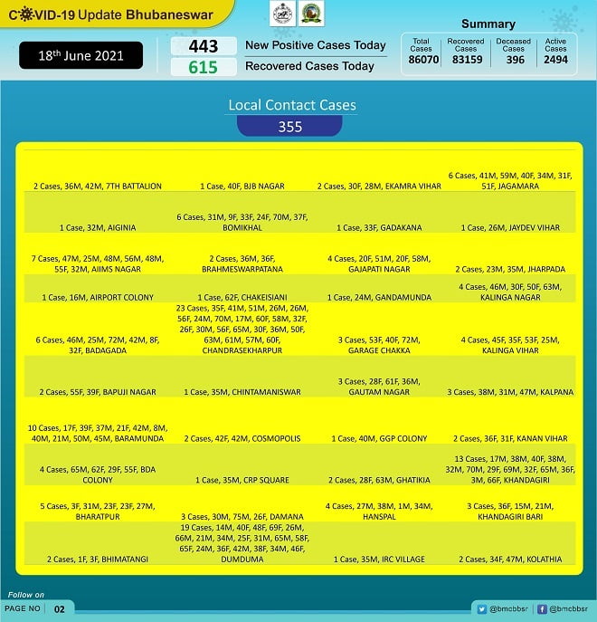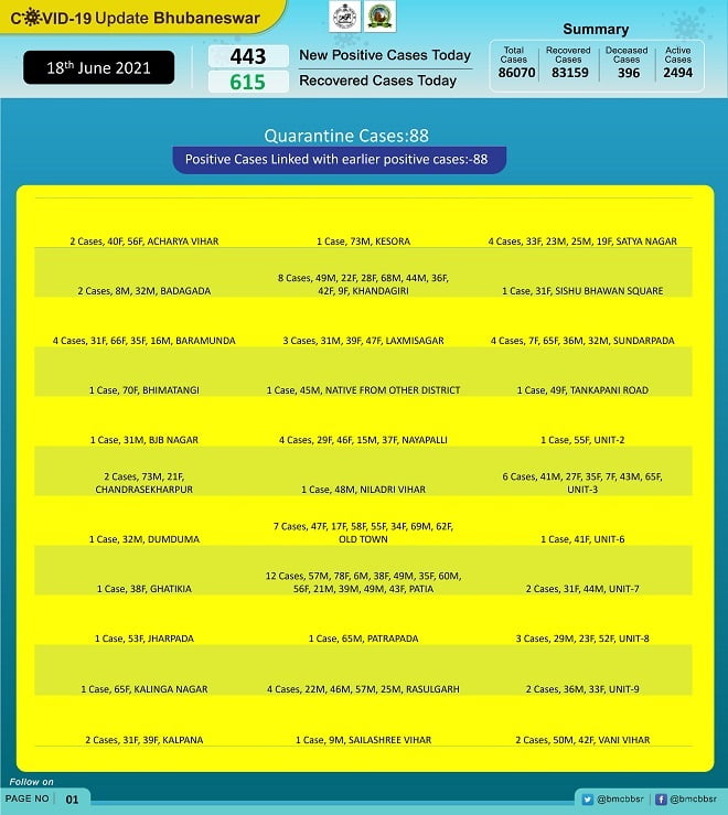 Of the new infections, 88 are quarantine and 355 are local contacts, according to the daily update shared by Bhubaneswar Municipal Corporation (BMC).