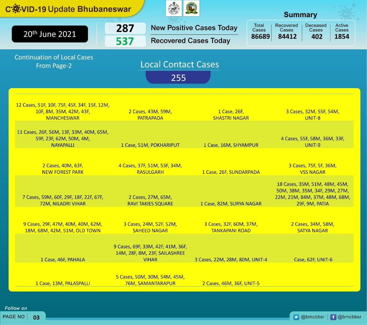 Of the new cases, 32 were from quarantine and 255 were local contacts, tweeted Bhubaneswar Municipal Corporation on Sunday.