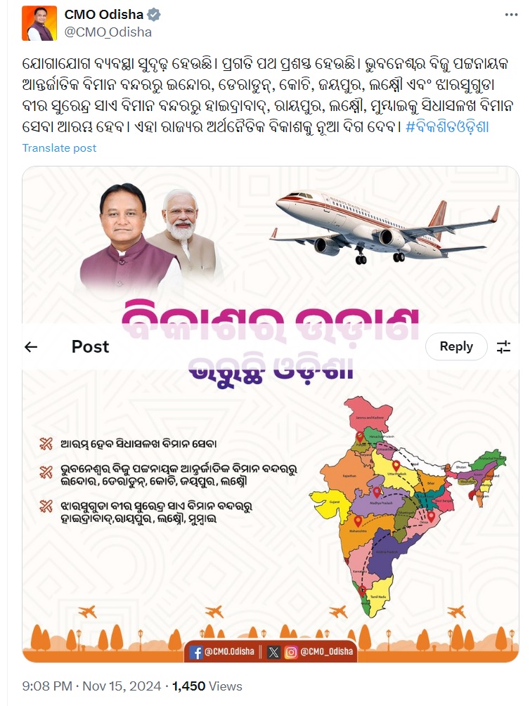 Similarly, the flight operators will provide services from Jharsuguda to Hyderabad, Raipur, Lucknow and Mumbai, the post on CMO said.