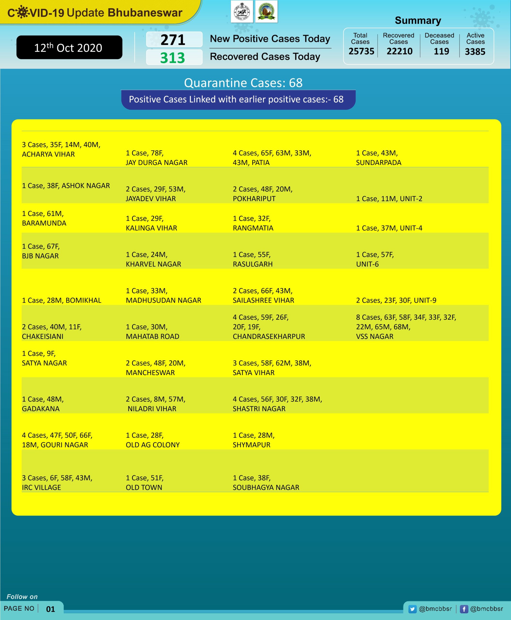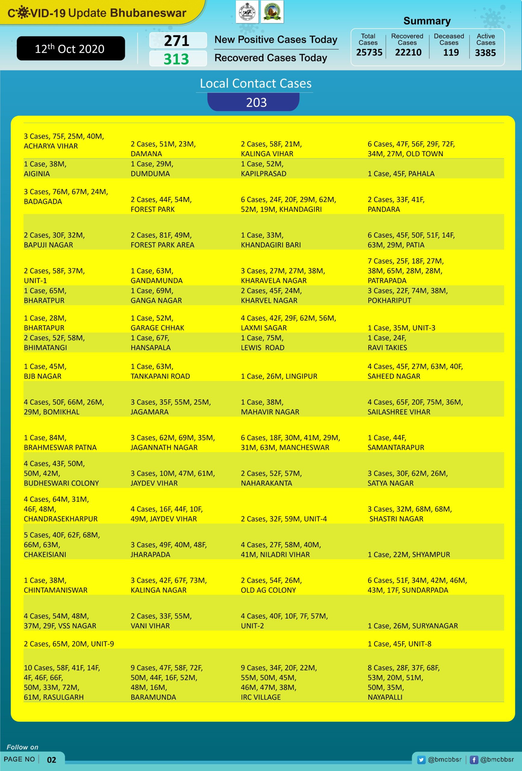 According to Bhubaneswar Municipal Corporation (BMC), 68 are quarantine and 203 local contact cases.