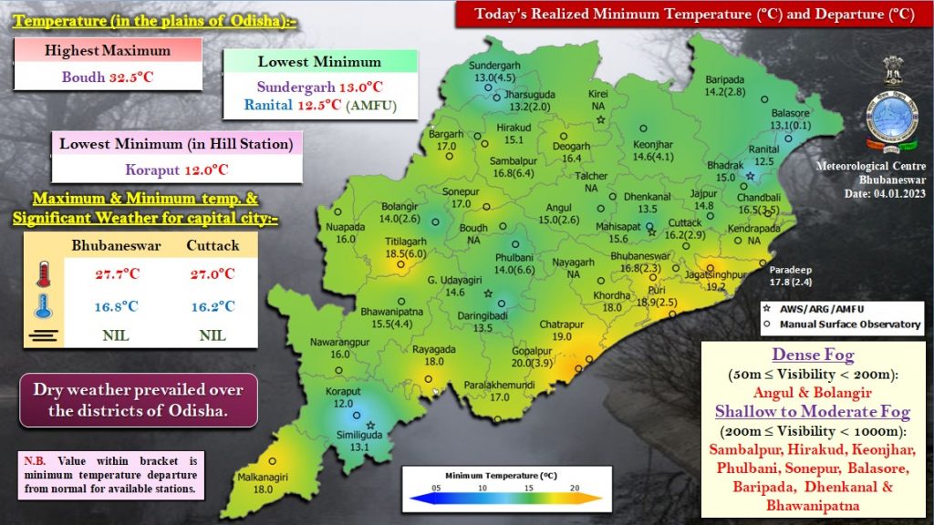 In the last 24 hours, Korapur recorded the lowest minimum temperature of 12 degree Celsius followed by Ranital at 12.5 degree Celsius, Sundargarh at 13 degree Celsius, Balasore and Similiguda in Koraput at 13.1 degree Celsius, Jharsuguda at 13.2 degree Celsius and Dhenkanal at 13.5 degree Celisus.