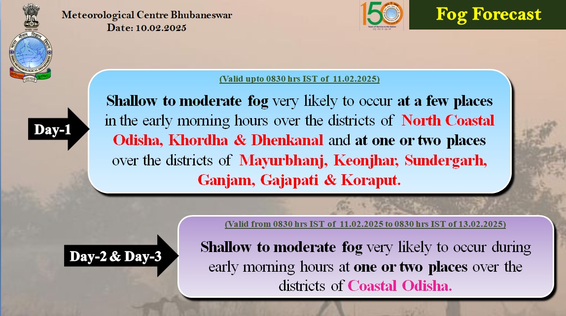 Yellow warning of dense fog has been issued for one or two places in Balasore, Bhadrak, Jajpur, Kendrapada, Cuttack, Jagatsinghpur, Khurda, Dhenkanal during the subsequent 24 hours.