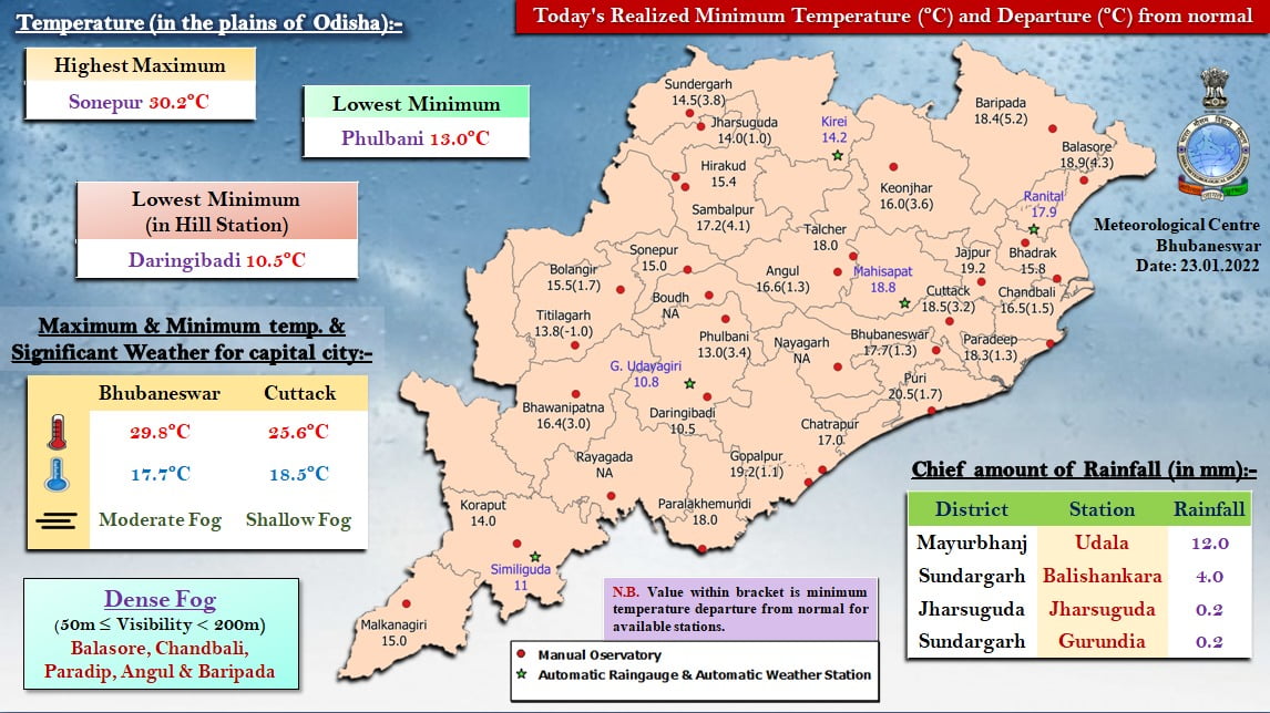 Coastal Odisha, Keonjhar, Mayurbhanj, Dhenkanal, Kandhamal, Rayagada, Malkangiri and Koraput are likely to experience light to moderate rain or thundershower during the subsequent 24 hours, Shallow to moderate fog is also likely to occur at one or two places in Jharsuguda, Sundargarh, Bargarh, Sambalpur, Angul, Bolangir, Boudh, Kandhamal and Kalahandi till 8. 30 am on January 25.