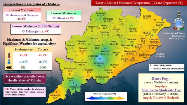 The twin cities of Bhubaneswar and Cuttack recorded 19.8°C each. Gopalpur, Cuttack, Angul, and Baripada experienced shallow to moderate fog.