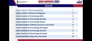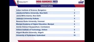 IIT-Madras and IISc Bangalore emerged the top educational institutes in the country. IISC, JNU, and Jamia Millia Islamia are the top 3 institutions in the universities category of the NIRF Rankings 2023.