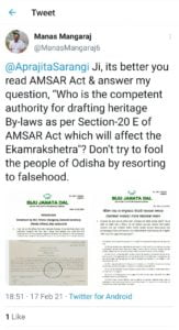 “I am not an IAS officer like Aparajita Sarangi. I may not have done such extensive research like her, but I know that anyone can understand in 5 minutes that Regional Director ASI, Kolkata is the competent authority for drafting of Heritage bylaws as per Section-20 E of the Ancient Monuments and Archaeological Sites and Remains Act, 1958 (AMSAR Act),” said Mangaraj in a press release.