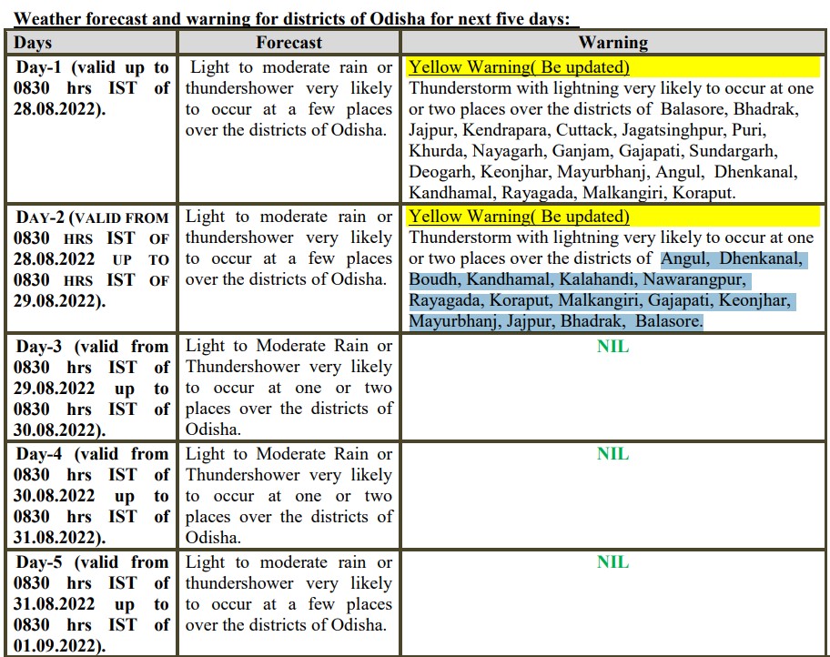 Though the Met office did not forecast heavy rainfall till August 31, it issued yellow warning for thunderstorm for Balasore, Bhadrak, Jajpur, Kendrapara, Cuttack, Jagatsinghpur, Puri, Khurda, Nayagarh, Ganjam, Gajapati, Sundargarh, Deogarh, Keonjhar, Mayurbhanj, Angul, Dhenkanal, Kandhamal, Rayagada, Malkangiri, Koraput districts till 8.30 am on August 28.