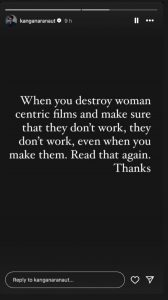 Mocking at the poor-box office collections, Kangana wrote on her insta handle, “When you destroy women-centric films and make sure that they don’t work, they don’t work, even when you make them. Read that again. Thanks.”